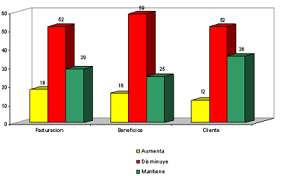 No tiene por qué existir relación entre el aumento de facturación y el de beneficios. Frente al grupo, siempre escaso, de empresas que aumentan beneficios (16%), el resto los disminuye (59%) o los mantiene (25%).