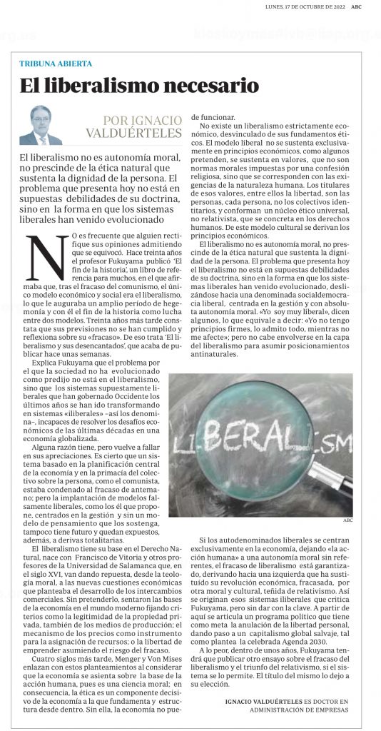 Por eso si los autodenominados liberales se centran exclusivamente en la economía, dejando lo demás a la autonomía moral, el fracaso de liberalismo  está garantizado, deslizándose hacia una izquierda que ha sustituído su revolución económica, fracasada,  por otra moral y cultural , teñida de relativismo. A partir de aquí se articula un programa político que tiene como meta en lo social …. Y la anulación de la libertad personal, dando paso a un  capitalismo global salvaje, diseñado  en la Agenda 2030. Y dentro de poco Fukuyama publicará otro ensayo sobre el fracaso del liberalismo y el triunfo del relativismo. El título del mismo lo dejo a su elección.