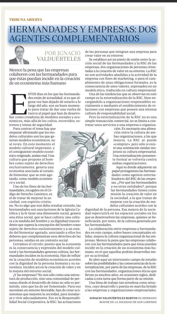 Se abre aquí un interesante campo de estudio sobre las posibilidades y las consecuencias de la externalización, por parte de las empresas, de la RSC con las hermandades, organizaciones éticas que llevan ya muchos años, en ocasiones siglos, dedicadas a esta tarea que forma parte de su misión.