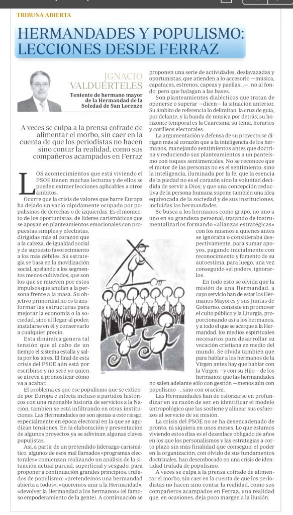 El problema es que ese populismo que se extiende por Europa e infecta incluso a partidos históricos con una razonable historia de servicios a la Nación, también se está  infiltrando en otras instituciones. Las Hermandades no son ajenas a este riesgo, especialmente en época electoral en la que se agudizan tensiones. En la elaboración y presentación de algunos proyectos ya se adivinan algunas claves populistas.