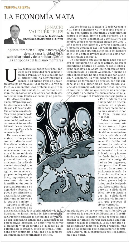 De “esa economía mata”, titular ya descontextualizado, a “el liberalismo mata” hay un paso y se da interesadamente. La economía, el intercambio de todas las realidades que posee el hombre,   es una cuestión radicalmente antropológica, es acción humana; no se agota o se resuelve en propuestas de gasto público, impuestos, o inversiones, sino en la identificación con la persona humana y su dignidad y libertad. No puede constituirse ni desarrollarse sin constituir una referencia a lo  que es el hombre.