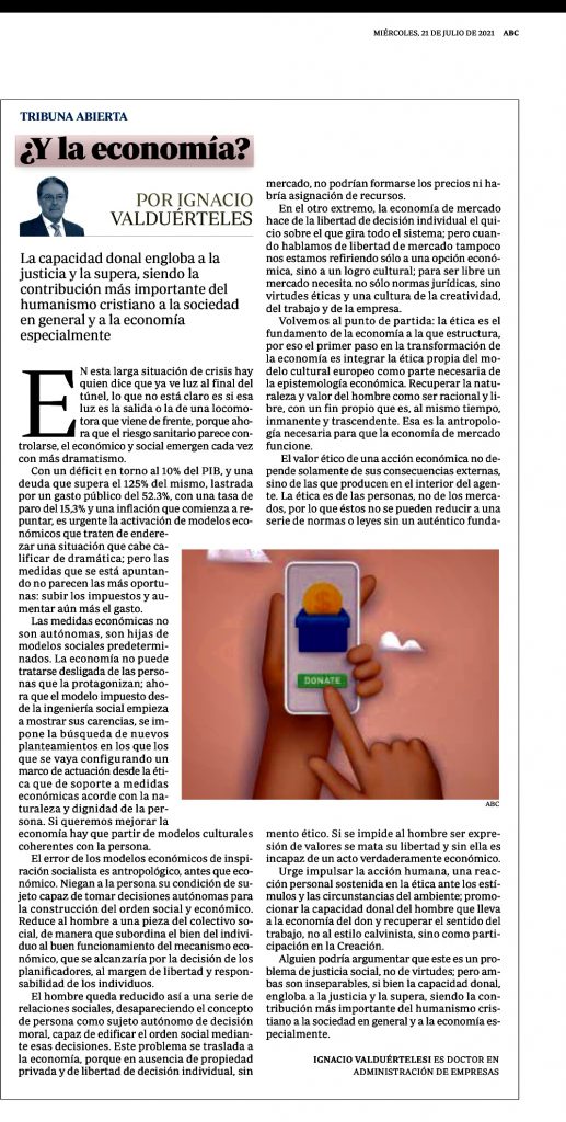 Las medidas económicas no son autónomas, son hijas de modelos sociales previos. La economía no puede tratarse desligada de las personas que la protagonizan; ahora que el modelo de convivencia impuesto desde la ingeniería social empieza a mostrar sus carencias, se impone la búsqueda de nuevos planteamientos en los que los que se vaya configurando un marco de actuación desde la ética que de soporte a medidas económicas acorde con la naturaleza y dignidad de la persona. Si queremos mejorar la economía hay que partir de modelos culturales coherentes con la persona.